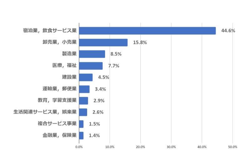 この自治体の産業構造の従業員数別トップ10(上記グラフ出展:地域経済分析システム「RESAS:リーサス」、平成28年6月調べ)は、「宿泊業・飲食サービス業」が44.6%と群を抜いて多い状況です。