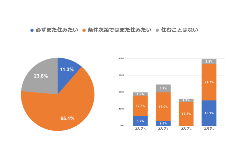 この自治体では「必ずまた住みたい」が11.3%、「条件次第ではまた住みたい」が65.1%、「住むことはない」が23.6%という結果で、Uターン意向有りと判断できる転出者が76.42%と7割も超えました。特に、全体の21.7%のエリアDへの転出者が「条件次第ではまた住みたい」を選択しています。