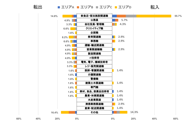 転出者の職種でも「飲食店・宿泊施設関連職」がトップの14.8%でしたが、転入者の職種と比較すると、転出者の方が職種のバラエティが広い傾向にあります。