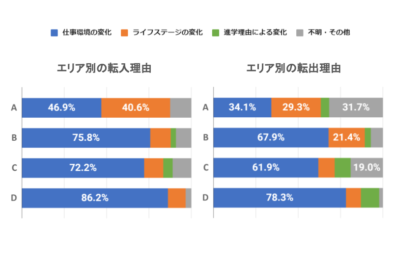 転出者も同様の傾向にあり、転出理由は「仕事環境の変化」が61.7%で最多。エリア別に見ても転入者の状況と同じく、エリアAの34.6%に対し、エリアDは78.3%と2倍の差がありました。近隣からの転出転入は、仕事よりも「家の購入・賃貸、相続、結婚、介護、離婚、別居」といった家族間におけるライフステージの変化と回答する比重が高いです。