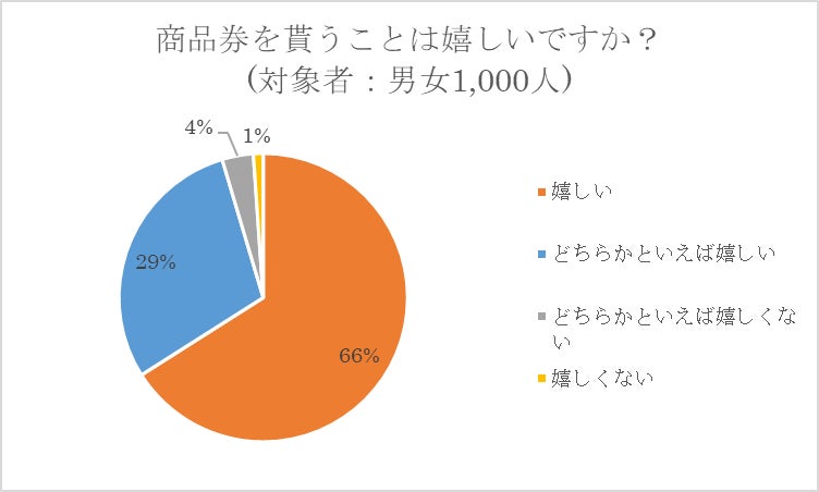 商品券を貰うことは嬉しいですか?という質問に、商品券をもらって嬉しい人が66%、どちらかといえば嬉しい人が29%、どちらかといえば嬉しくない人が4%、嬉しくない人が1%という結果になりました。
