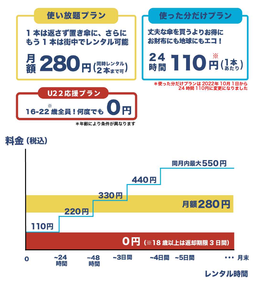 このような背景から、この度は熟考のうえ料金改定をさせていただき、持続性を高めるだけではなく、今よりもスポット数の増加、傘の在庫の充実、オペレーション強化による品質保持基準の向上を通じて、ご利用者様に更なる便益をお届けすると同時に、使い捨て傘ゼロの社会を目指し、今後も一層のサービス向上に努めて参ります。