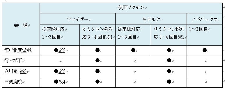 立川南 :従来株ファイザー4回目、従来株モデルナ(3・4回目)、ノババックス(1~3回目)