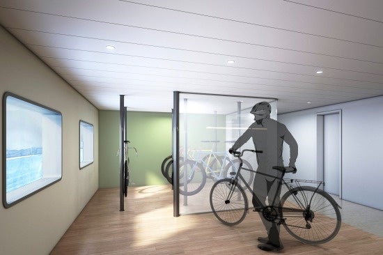 ・ガラスウオールのブース内にポール式スタンドを設置したサイクルピット。車両甲板からエレベータに載せてロードバイクを持ち込めます。
