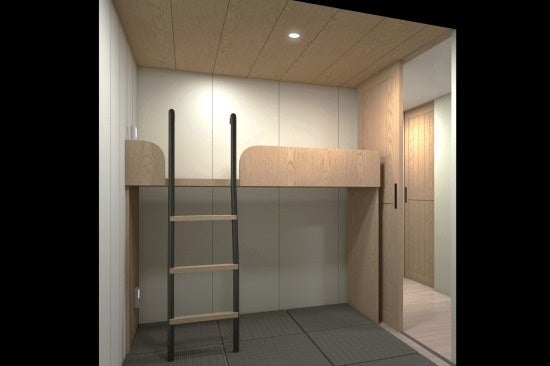 ・室内に上下2層のロフト式のびのび席を配置。上段は性能繊維構造体「ブレスエアー®」のマットレス、下段は遠赤外線床暖房「ヒートプラス」付きの畳敷きで、2名までなら夜行便でも快適