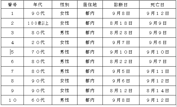 新型コロナウイルスに関連した患者の死亡について business Twitter Facebook はてブ Pocket LINE コピー 2022.09.17 この記事は約1分で読めます。 都内で新型コロナウイルスに感染した方が死亡されましたのでお知らせします。 お亡くなりになった方のご冥福をお祈り申し上げます。 ※ 患者・御家族の人権尊重・個人情報保護に御理解と御配慮をお願いします。