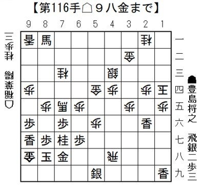 ▲1四歩 △同 玉 ▲6八歩 △6七香成 ▲同 歩 △5六歩 ▲2八香 △4六角 ▲2六香 △5七角成 ▲8八玉 △3九馬 ▲6三角 △7五馬 ▲8一角成 △4八飛 ▲5九銀 △9七銀 ▲同 香 △9八金 まで116手で後手の勝ち