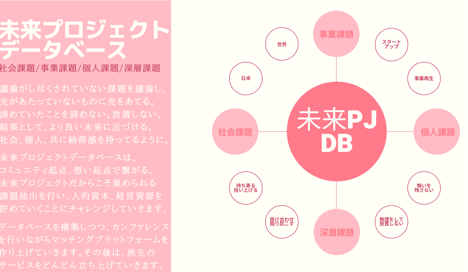 我々は、『未来プロジェクトデータベース構想』(https://prtimes.jp/main/html/rd/p/000000467.000018590.html)を推し進めており、「社会課題/事業課題/個人課題/深層課題」を集積しています。