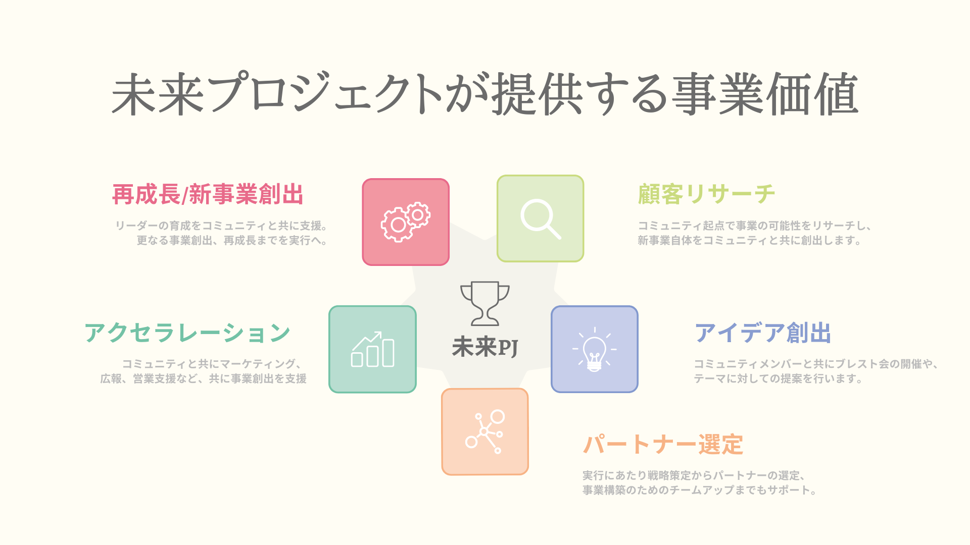 - 未来パートナー:個人で、共に事業を作ったり、プロジェクトを進めていく方々。