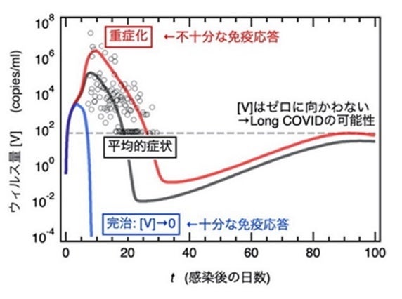 図. 感染後の宿主内ウイルス量 [V] の時間変化。「平均的症状」は数理モデルを臨床データに適合して得られたベースラインモデルによる結果。「重症化」は加齢によるリスク因子 (抗原提示細胞による活性の数10%程度の低下およびI型インターフェロン自己抗体によるシグナル伝達の遮断) を考慮した“弱められた”免疫応答に基づく結果。逆に「完治」は 抗原提示活性および形質細胞による抗体産生率を数倍に増加させた“強められた”免疫応答に基づく結果。「重症化」だけでなく「平均的症状」の場合でも、[V] はゼロではなく有限の値へと向かい、ウイルスは宿主から完全には除去されない。一方、「完治」では宿主内ウイルスが事実上完全に除去される