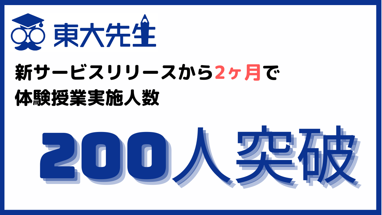 株式会社東大先生(本社:東京都新宿区 代表取締役社長:鈴木健太、以下当社)の運営するオンライン家庭教師サービス「東大先生」は7月の新サービスリリースからわずか2ヶ月で、体験授業実施人数が200人を突破しました。