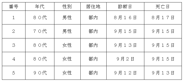 新型コロナウイルスに関連した患者の死亡について business Twitter Facebook はてブ Pocket LINE コピー 2022.09.19 この記事は約1分で読めます。 都内で新型コロナウイルスに感染した方が死亡されましたのでお知らせします。 お亡くなりになった方のご冥福をお祈り申し上げます。 ※ 患者・御家族の人権尊重・個人情報保護に御理解と御配慮をお願いします。
