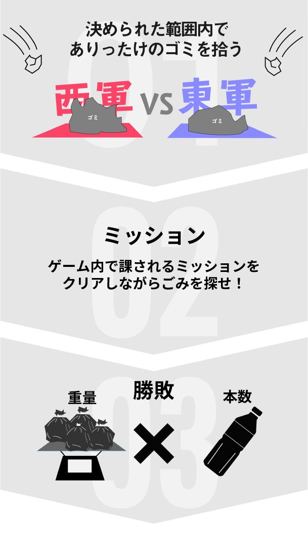 イベントの進み方あらかじめ赤と青の2チームに分かれて、最終的に拾ったゴミの量×ペットボトルの本数で競います。
