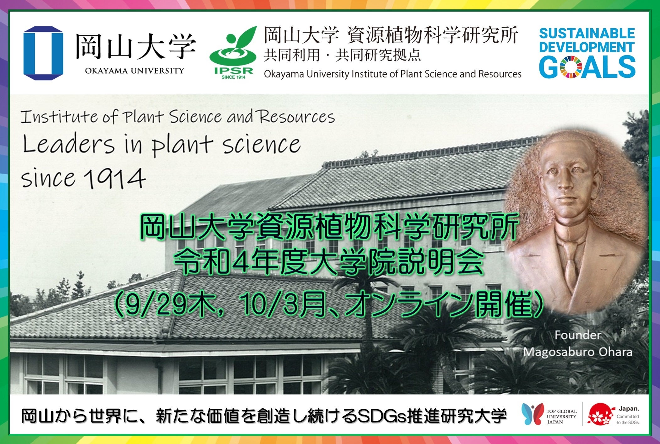 国立大学法人岡山大学(本部:岡山市北区、学長:槇野博史)資源植物科学研究所(倉敷市)では、大学院進学を検討されている皆様を対象に、大学院説明会を2022年9月29日(木)と10月3日(月)にオンラインで開催します。