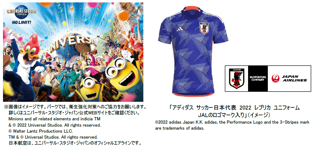 JALグループ国内線に対象期間中、2 回ご搭乗いただくと抽選で、ユニバーサル・スタジオ・ジャパ ン「 JALプレミアムナイト」へのご招待券や「アディダス サッカー日本代表 2022 レプリカユニフォーム JALのロゴマーク入り」などが当たります