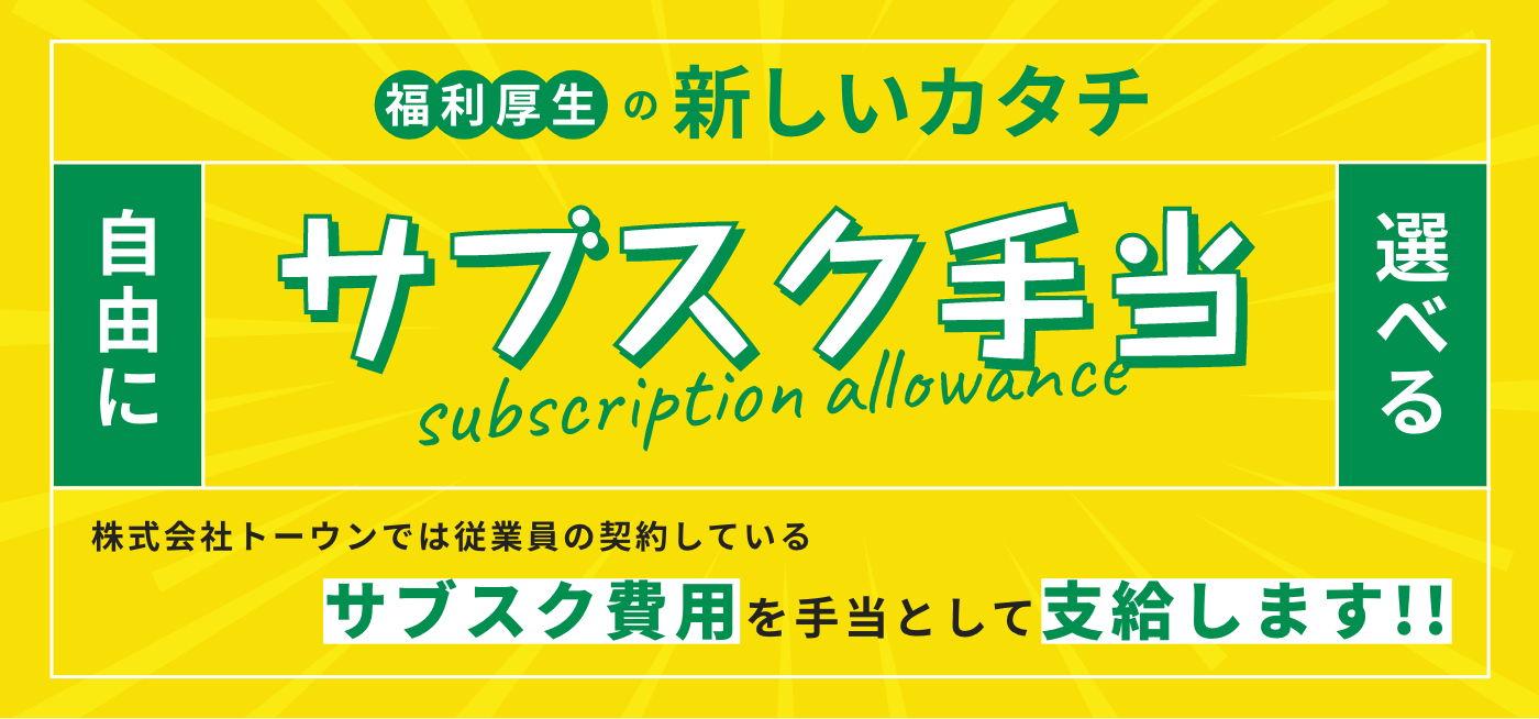 建設業・建設設計、施工を行っている「株式会社トーウン」(所在地:大阪府大阪市、代表取締役:山本ゆうじ)は、従業員への福利厚生と若年層を対象とした雇用促進の一環として「サブスク手当」を開始します。とくに、求人活動は独自の制度として積極的にアピールし、新卒や若年層の人材獲得へとつなげます。