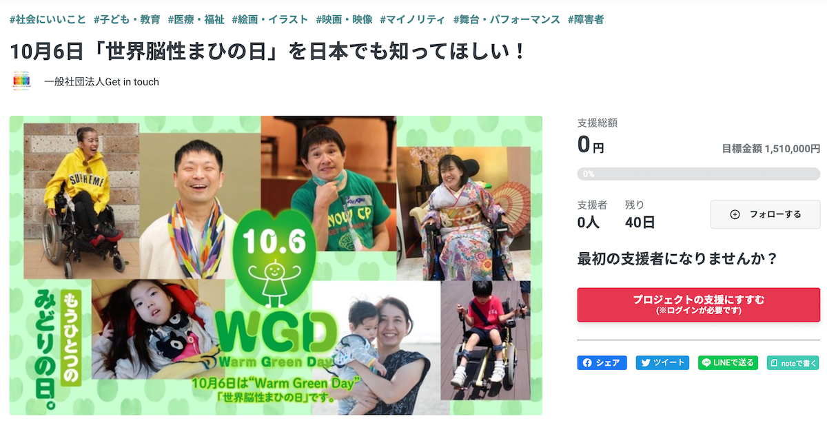 「日本では脳性まひの日は知られていない」というひとりの当事者の声から、「世界自閉症の日」を「Warm Blue Day」とし、10年間活動を続けてきたGet in touchが、日本においても「世界脳性まひの日」を広めるために「Warm Green Day(WGD)」(ウォーム・グリーン・デー/あたたかなみどりの日)と名付けました。