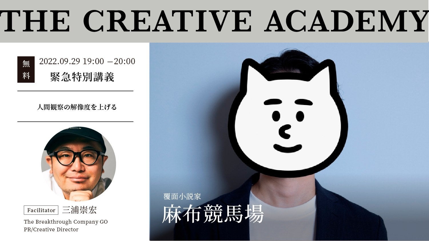 クリエイターはもちろん、経営者やマーケター、ビジネスプロデューサーなど、企画を必要とするすべてのビジネスパーソンにとって、生活者や顧客、すなわち人間を解像度高く理解することは必要不可欠です。しかし、今の時代においてはライフスタイルと価値観が多様化し、生活者の感情をリアルに捉えることが困難になっているのも事実です。そこで、この度「THE CREATIVE ACADEMY」では、冷徹な視点で港区の人間を捉え、SNSでのつぶやきを文学とまで言わしめた覆面小説家・麻布競馬場氏をお招きし、人間観察の解像度を高めるための思考法や技術を学ぶ特別講義を開催します。聞き手は、麻布競馬場氏にSNSで上でよくいじられるThe Breakthrough Company GOの代表取締役・PR/Creative Directorの三浦崇宏が担当します。