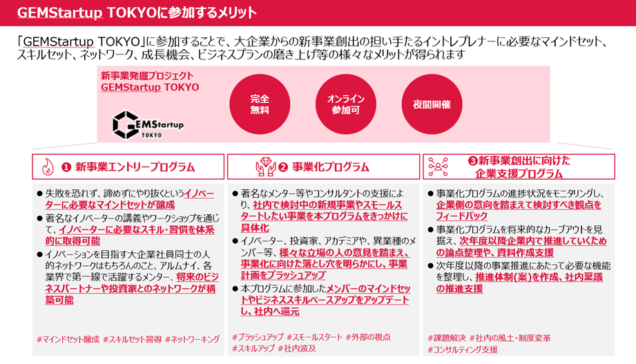 民間企業のリソースを活用し、東京都内で起業や新事業を創出したい方にご応募いただけます。完全無料、オンライン参加可、夜間開催のプログラムですので、ご興味をお持ちの方はぜひこの機会にお申込みください。