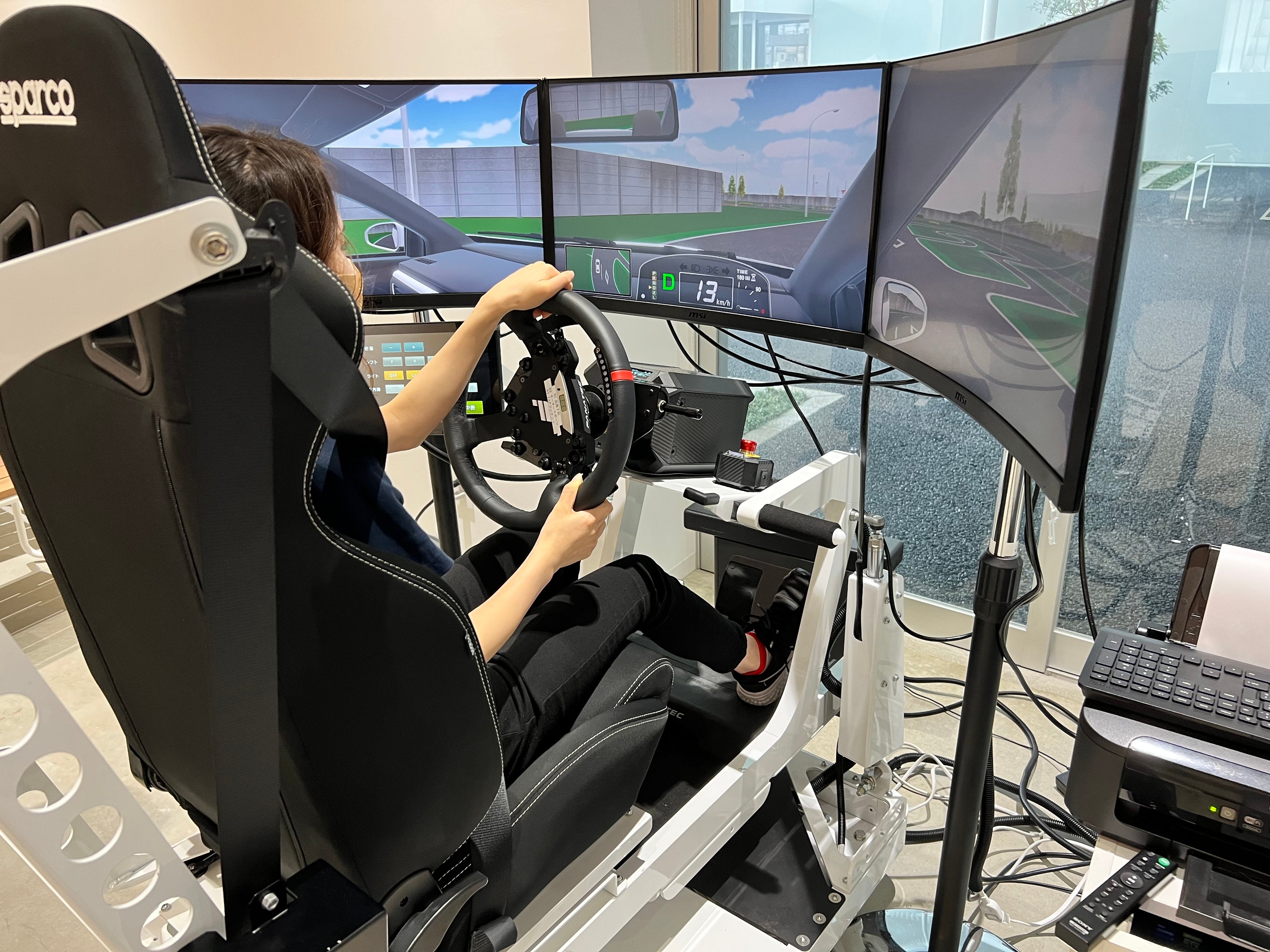 初回の打合せでは、早速、学生達もドライビングシミュレーターを体験しました。