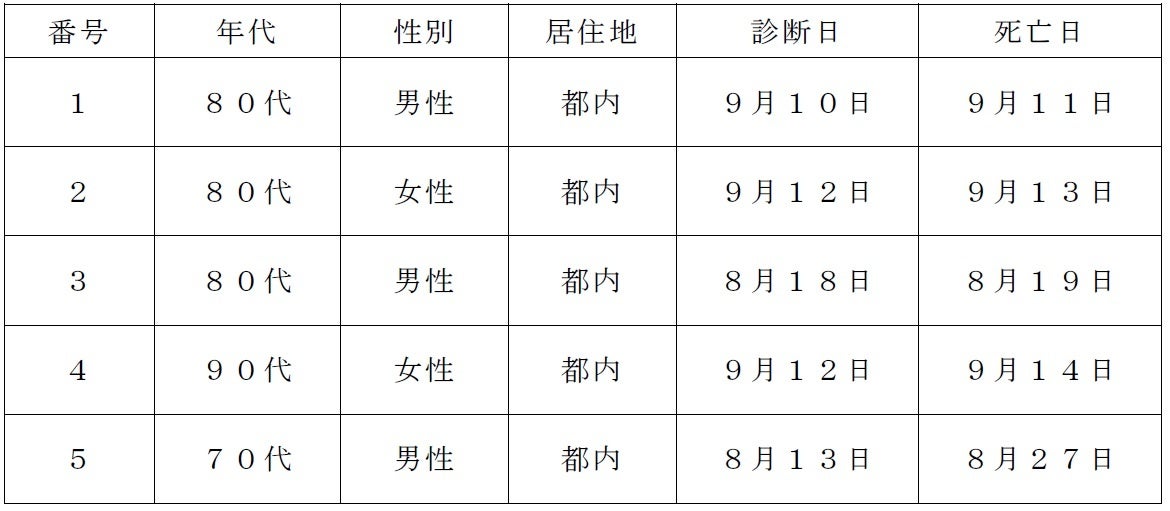 新型コロナウイルスに関連した患者の死亡について business Twitter Facebook はてブ Pocket LINE コピー 2022.09.20 この記事は約1分で読めます。 都内で新型コロナウイルスに感染した方が死亡されましたのでお知らせします。 お亡くなりになった方のご冥福をお祈り申し上げます。 ※ 患者・御家族の人権尊重・個人情報保護に御理解と御配慮をお願いします。