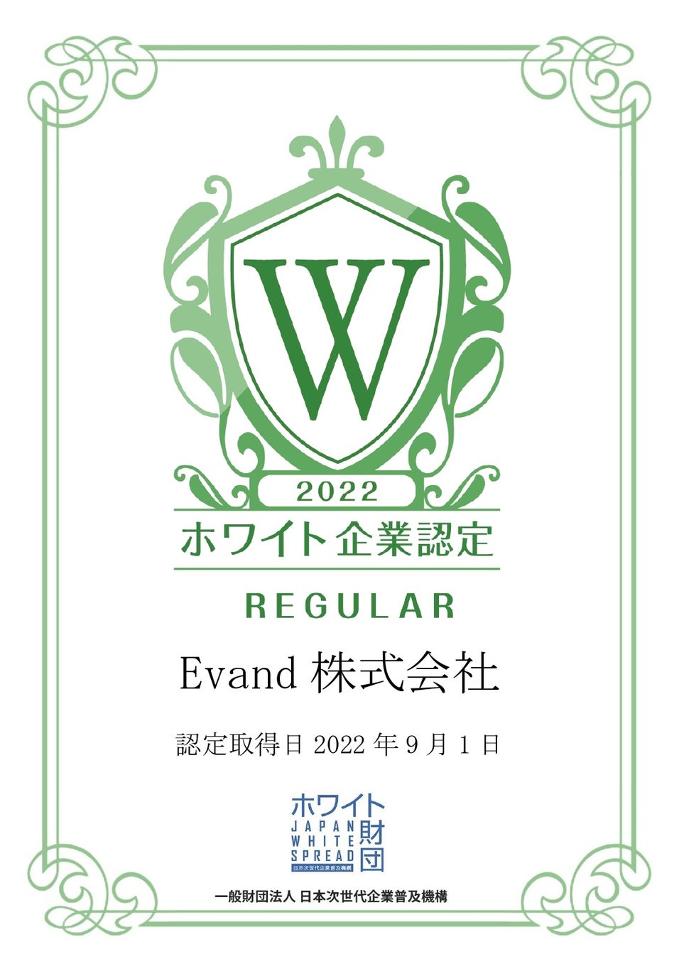 2022年9月1日、Evand株式会社が、一般財団法人日本次世代企業普及機構(通称:ホワイト財団)が運営する「ホワイト企業認定 レギュラー」を取得しましたことをお知らせいたします。
