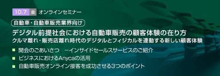 本セミナーでは、デジタル前提社会における、お客様との接客コミュニケーション、販売店網の再構築、試乗や契約など、自動車販売におけるデジタル活用顧客体験の最先端をご紹介しますので是非ご参加ください。