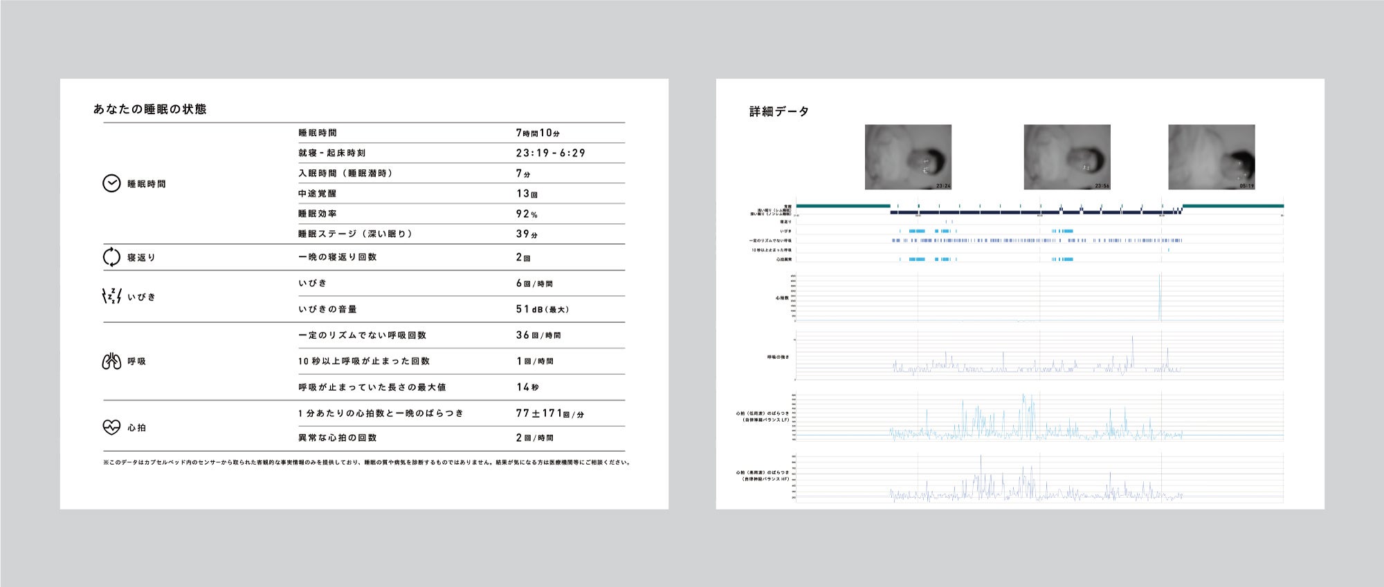 当社は2021年12月より一部店舗において、宿泊されたお客様の睡眠状態を測定するサービス「9h sleep fitscan」を開始しました。本サービスは、お客様のご承諾の上、宿泊中の睡眠データを赤外線カメラ・集音マイク・体動センサーで収集し、解析するものです。360度体を包み込むカプセルユニットが高機能なセンシングを可能にしており、収集したデータは弊社独自のプログラムで解析をかけております。お客様には後日、心拍数やいびき、無呼吸になった回数・時間などのデータを睡眠レポートの形式で提供しております。