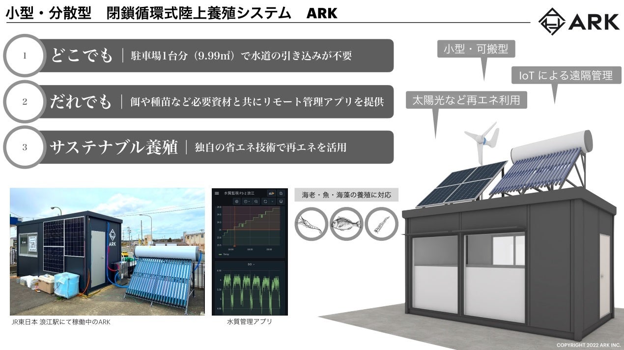 これまでの一般的な養殖モデルである海面養殖は、海水温の上昇や自然災害の影響を受けやすい課題がありましたが、自然状況に左右されにくく環境負荷の低い「陸上養殖」にて展開することによりエサや糞などによる海水汚染も防ぐことが可能となります。またARK株式会社が手掛ける小型・分散型陸上養殖設備を活用し、設計並びに運転、メンテナンスまで一貫したパッケージで展開する陸上養殖プラットフォームを構築し、更に飼育環境をIoTによりデータ管理することで、低コスト化、省力化等の技術にて安定した商品供給を行います。