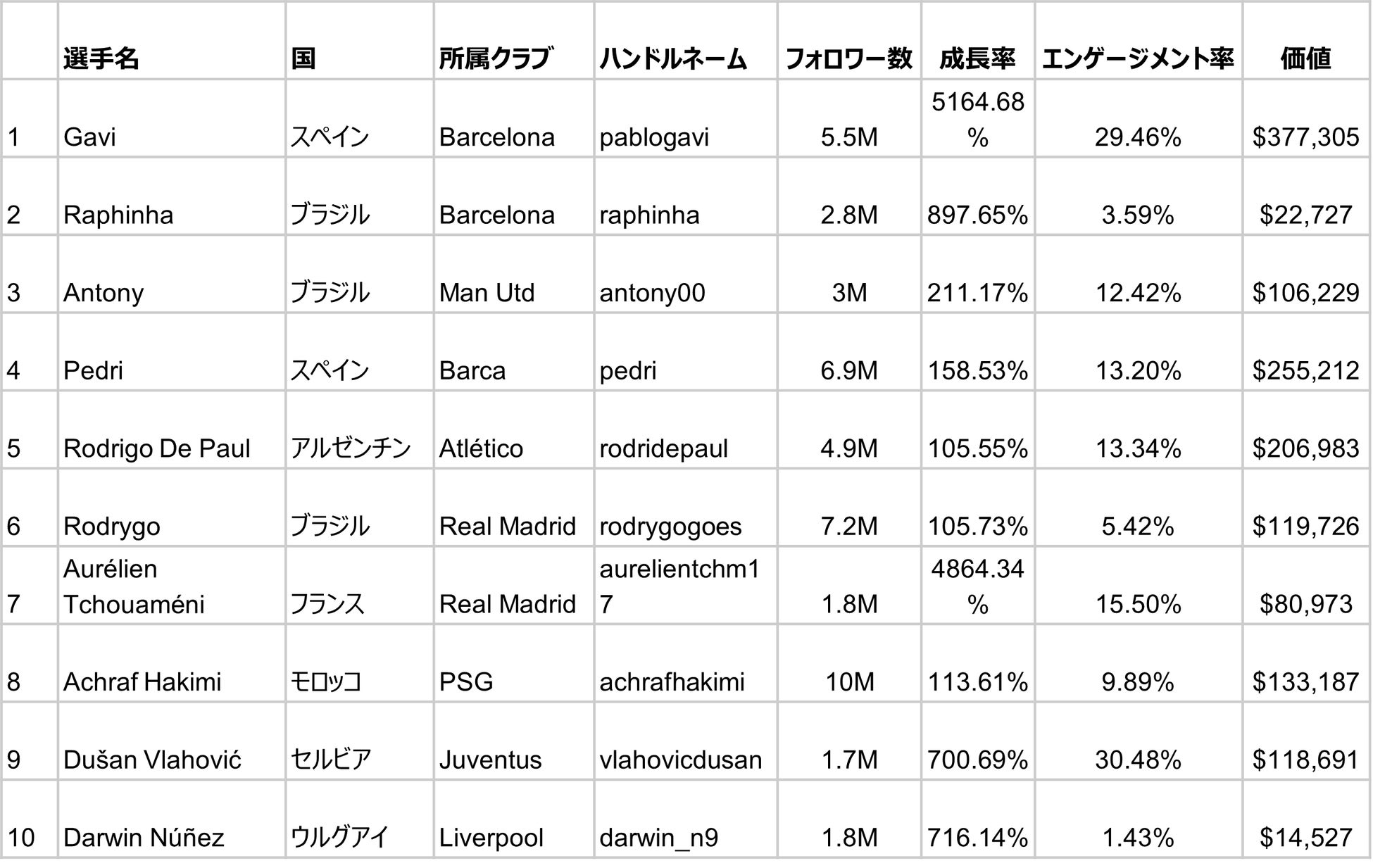 本ランキングは、ニールセンの提供するサービス「InfluenceScope」に基づいています。当社はこのプラットフォームを利用して、Instagramの総フォロワー数、フォロワー成長率、エンゲージメント率、投稿ごとの平均ブランド価値などを評価し、どのプレイヤーが最もソーシャルメディア上で価値を提供しているかを判断しています。詳しくは、ニールセンFIFA World Cup 2022™: the essential data hubをご覧ください。