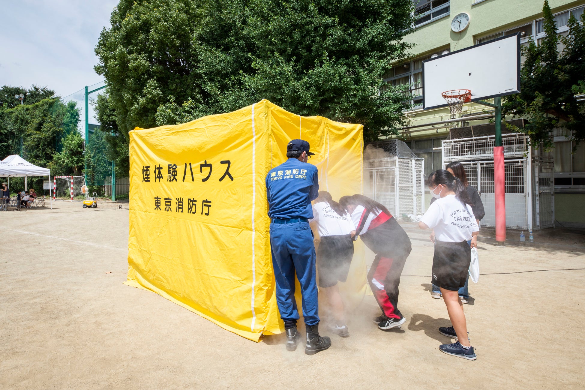 ⽕災が発⽣したときの煙の“怖さ”や“避難⽅法”などを疑似体験出来る「煙体験ハウス」。