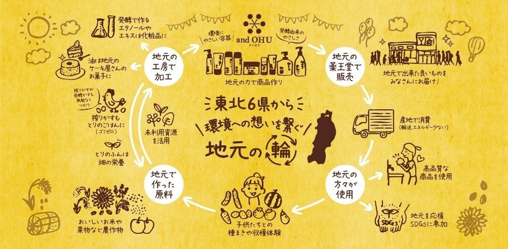 これまでも「and OHU(アンオフ)」では、生産者の元へ直接足を運び、東北の作り手の顔が見え、機能性豊かな原料にこだわり商品開発をしてまいりました。例えば、岩手県奥州市の休耕田を活用し栽培したオーガニック米を原料したオーガニック米エタノール、そのエタノール製造を行う際に発生する発酵粕をエサとする鶏の鶏糞を利用し、岩手県奥州市で無農薬・無化学肥料で栽培したひまわりの種子を搾った油、また国内随一の雑穀の産地である岩手県花巻市でヒエを精製する際に出るヒエヌカを搾った油、などを活用してまいりました。