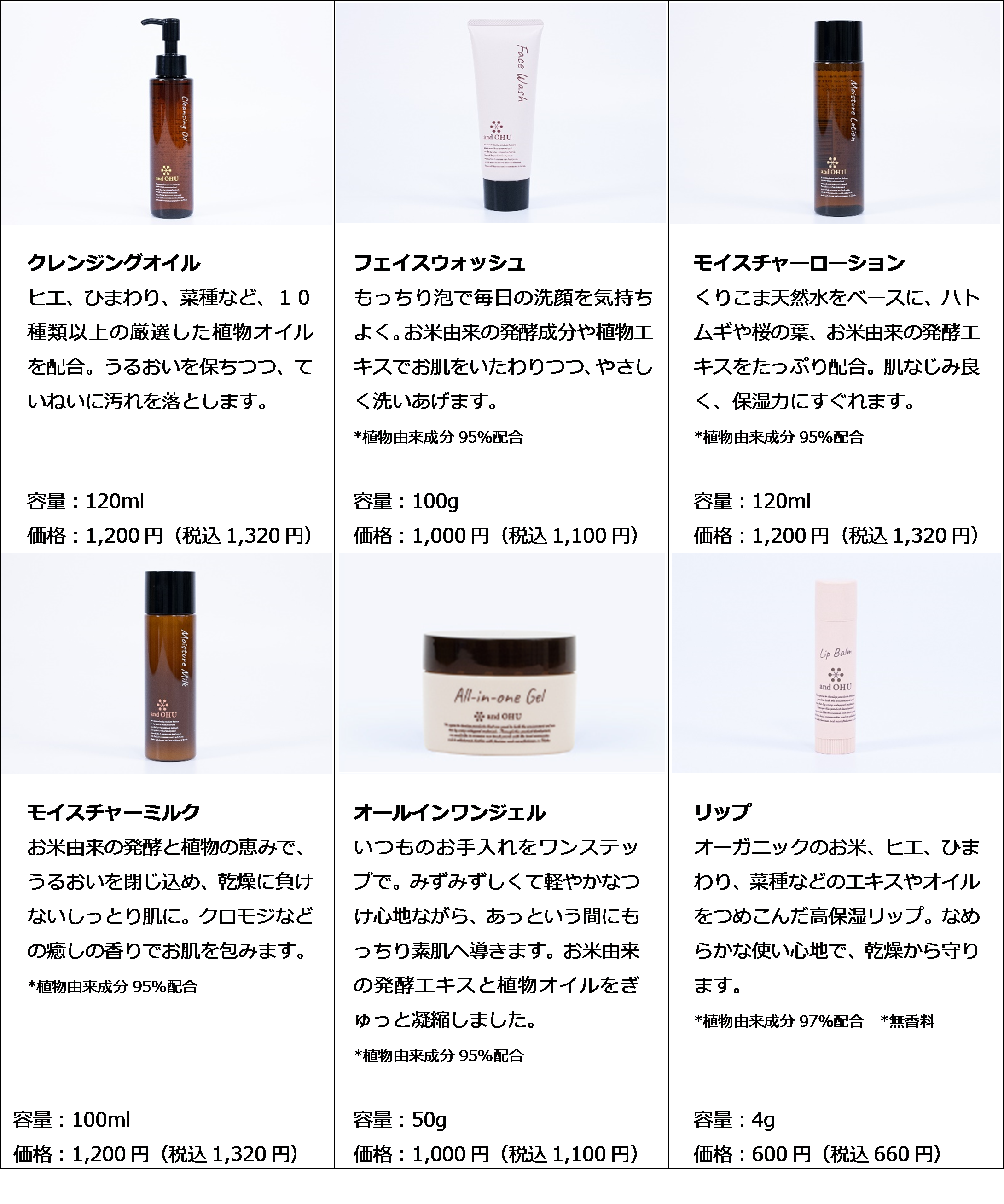 既に販売中のスキンケア6商品(クレンジングオイル、フェイスウォッシュ、モイスチャーローション、モイスチャーミルク、オールインワンジェル、リップクリーム)の商品概要および販売情報は下記のとおりです。