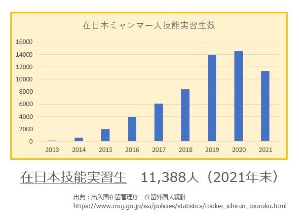 近年、ミャンマーからの技能実習生の数は増加しており、2010年から2020年の10年間で、その人数は約99倍にも上ります。