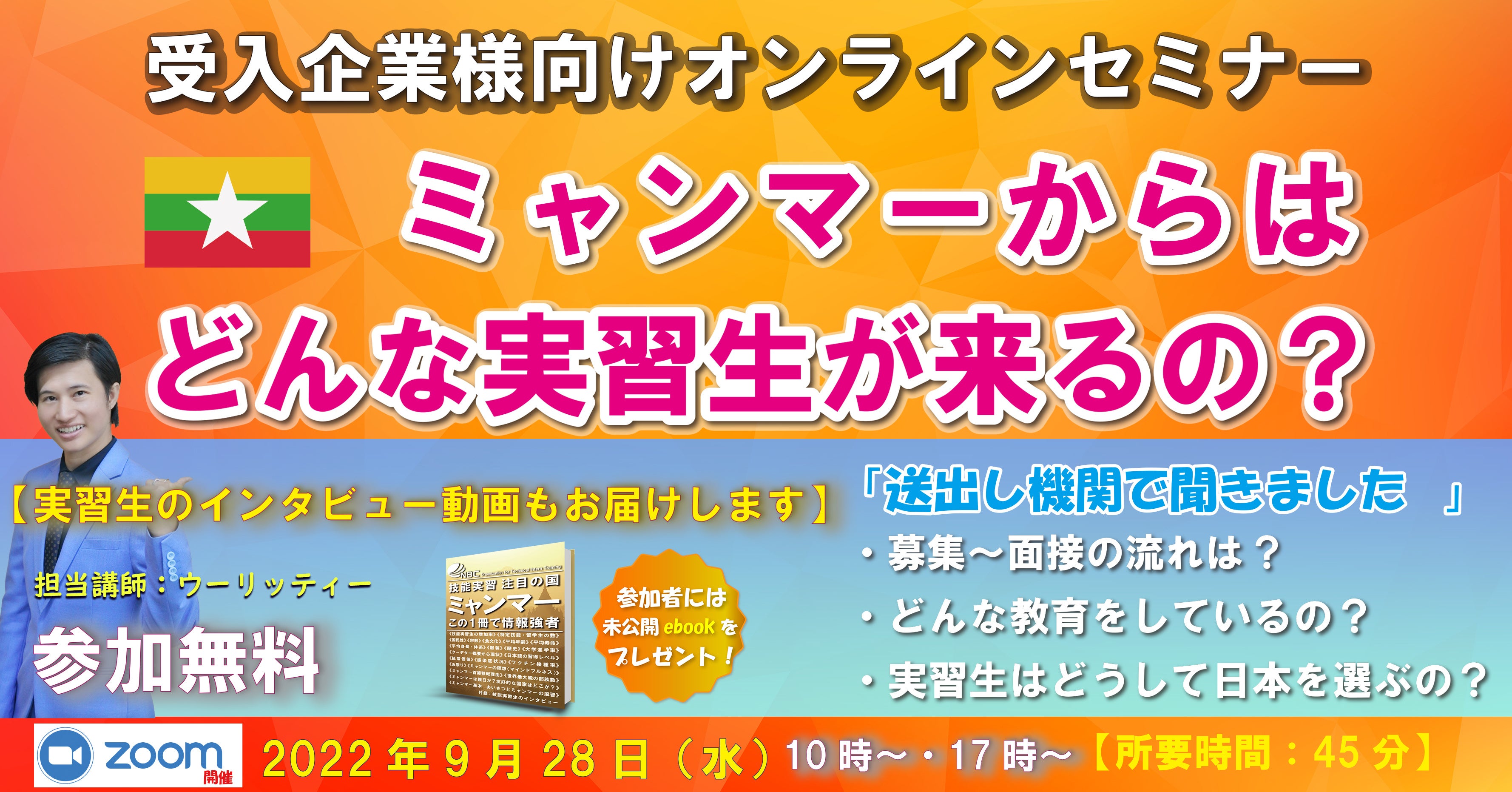 - 9/28開催無料オンラインセミナー「ミャンマーからはどんな実習生が来るの?」