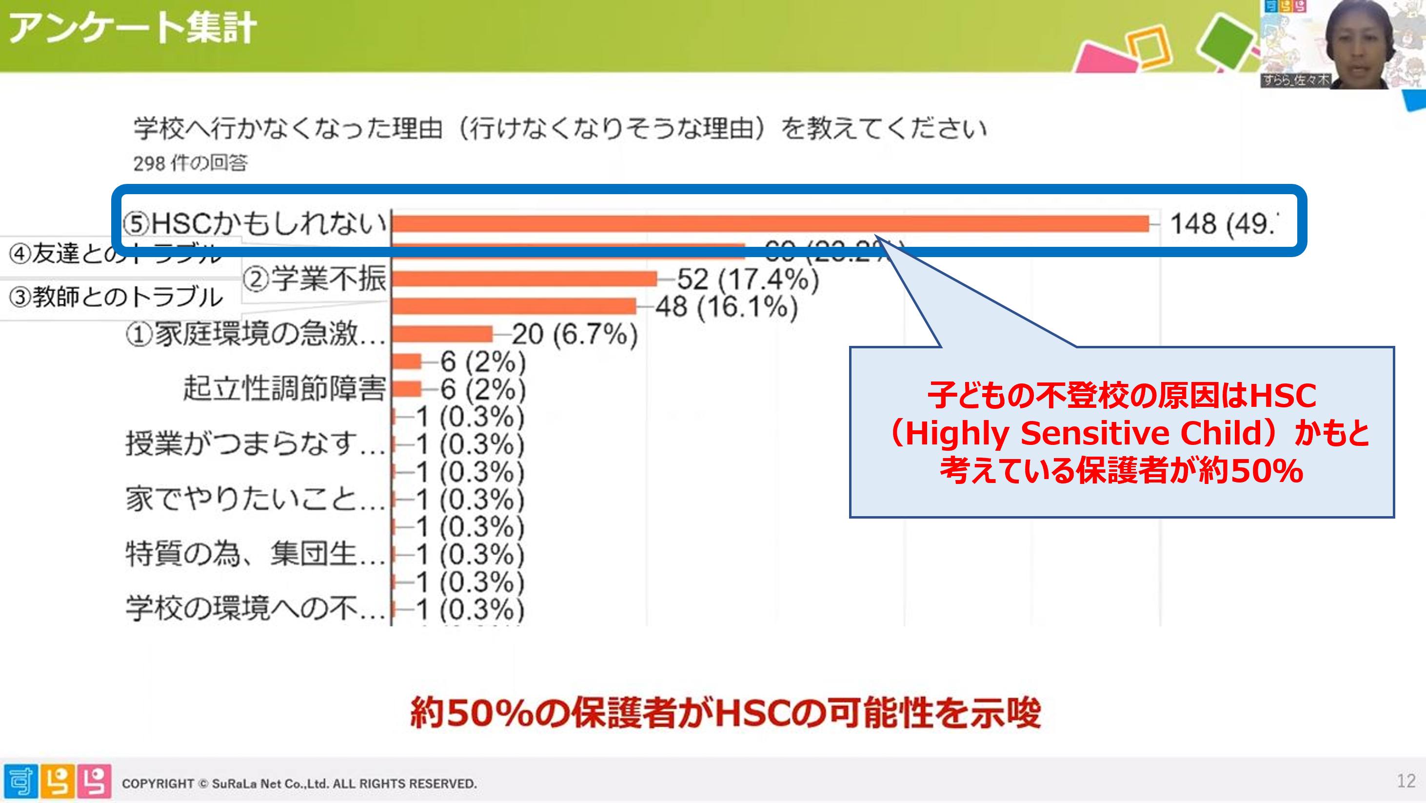 また、セミナーに参加された保護者を対象に事前に行ったアンケートでは、子どもの不登校の原因は人一倍敏感だったり、繊細なこと(HSC:Highly Sensitive Child)かもしれないと考えている方が約50%いることが分かりました。さらに、子どもの強い不安に対してどう接したらよいかわからない保護者が約60%もいました。そこでセミナーでは、HSCと不安症の違いについても解説。「子どもの気持ち」へ目を向けることの重要性と実践のコツをお伝えしました。