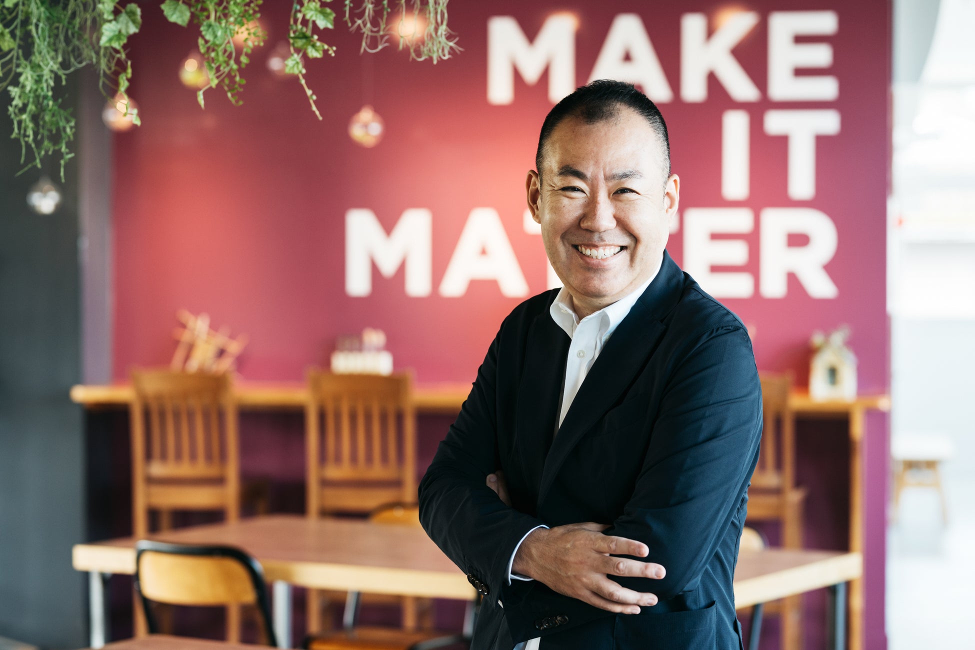 1970年、宮崎県生まれ。宮崎市高岡町で廃校となった小学校をリノベーションし、カフェやシェアオフィス・コワーキングを併設するムカサハブ(本社 所在地)を運営。”世界があこがれる九州をつくる” を経営理念として、九州産の農業素材のみで作られた「九州パンケーキミックス」をはじめとする、「KYUSHU ISLAND®︎/九州アイランド」プロダクトシリーズを国内外に展開。