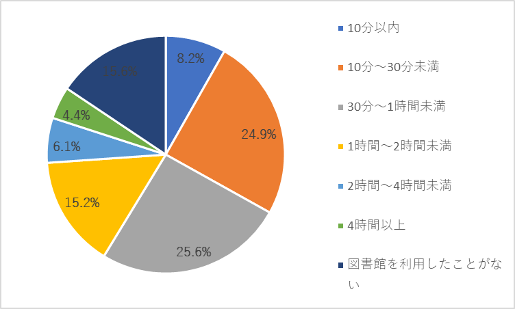 図書館の滞在時間で1番多かった回答が30分~1時間未満で25.6%、10~30分未満が24.9%という結果でした。約半数の人が図書館に30分以上滞在しないという結果でした。