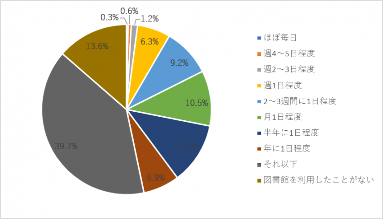どのくらいの頻度で、図書館を利用しますか?の質問に1年に1日以下と回答した人が最も多く39.7%、次に図書館を利用したことがない人が13.6%、半年に1日程度の人が11.7%という結果でした。