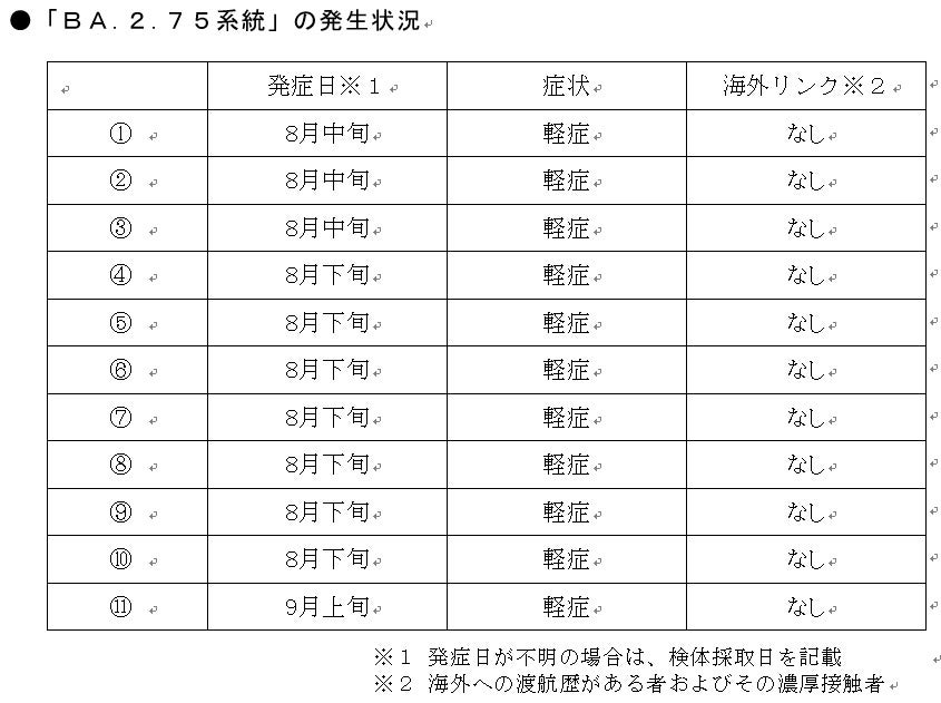 この度、ゲノム解析の結果、新たに、オミクロン株の亜系統である「BA.2.75系統」を11例確認したため、下記のとおり、お知らせいたします。