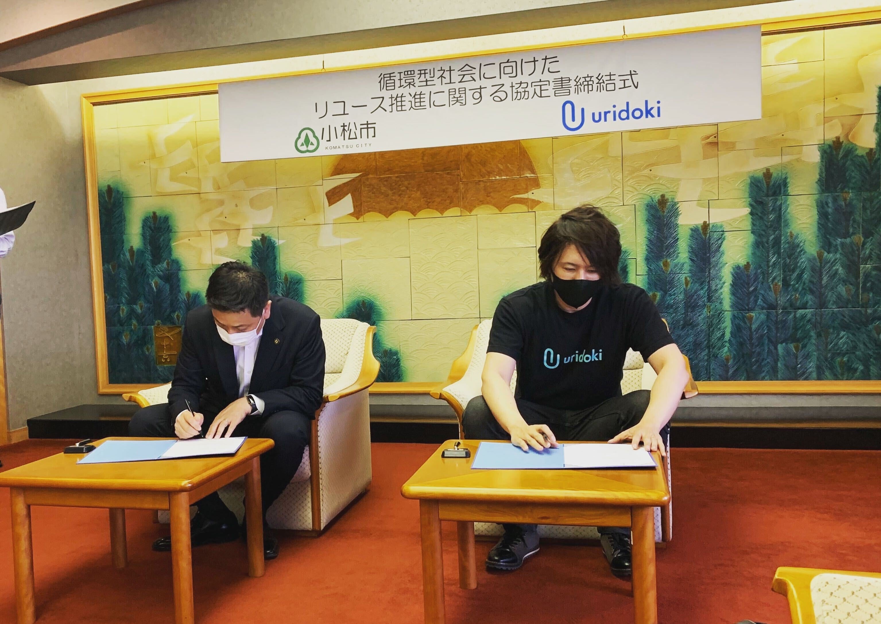 (写真左から)小松市市長 宮橋勝栄、ウリドキ代表取締役 木暮康雄、ウリドキ 鈴木雅史