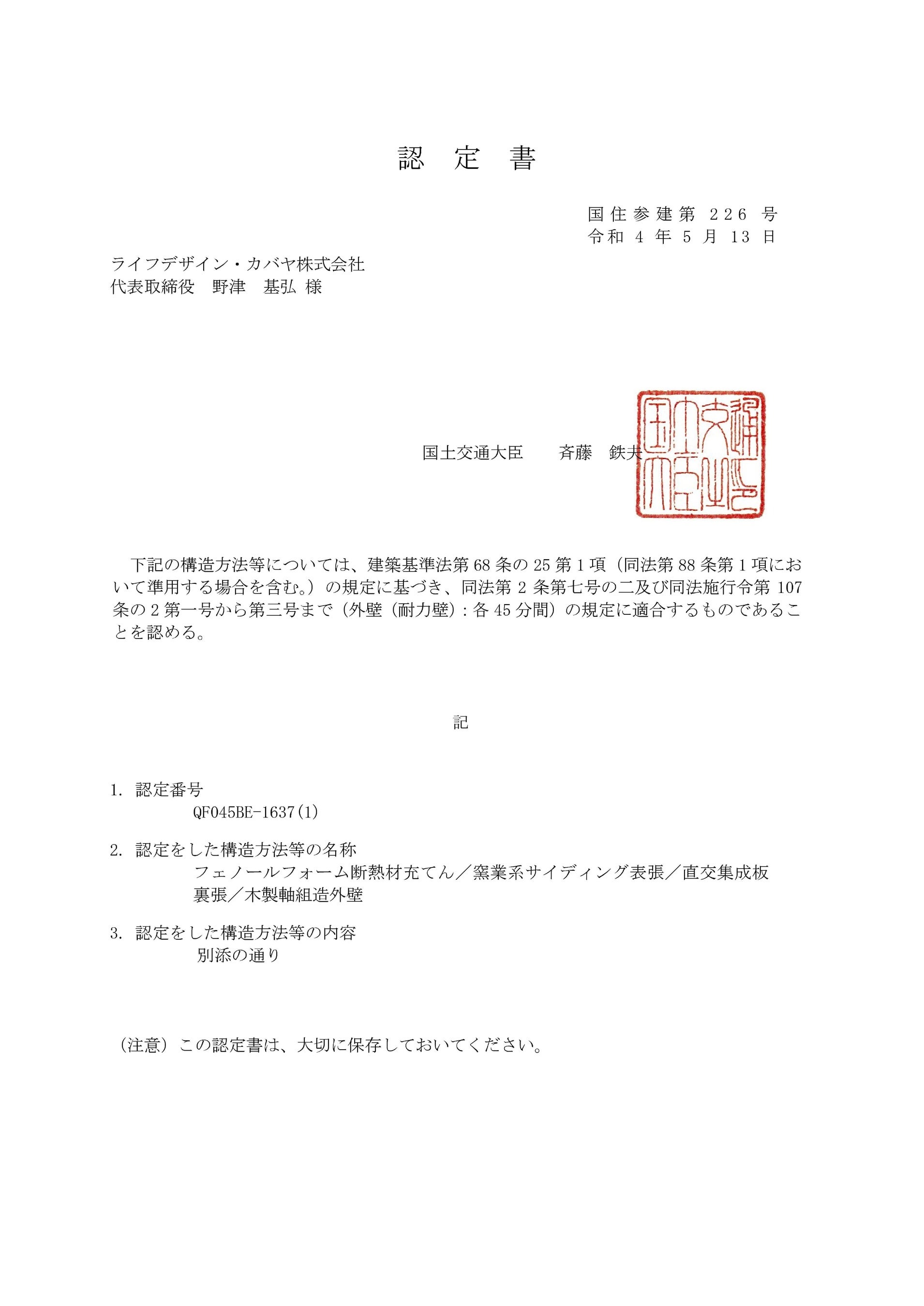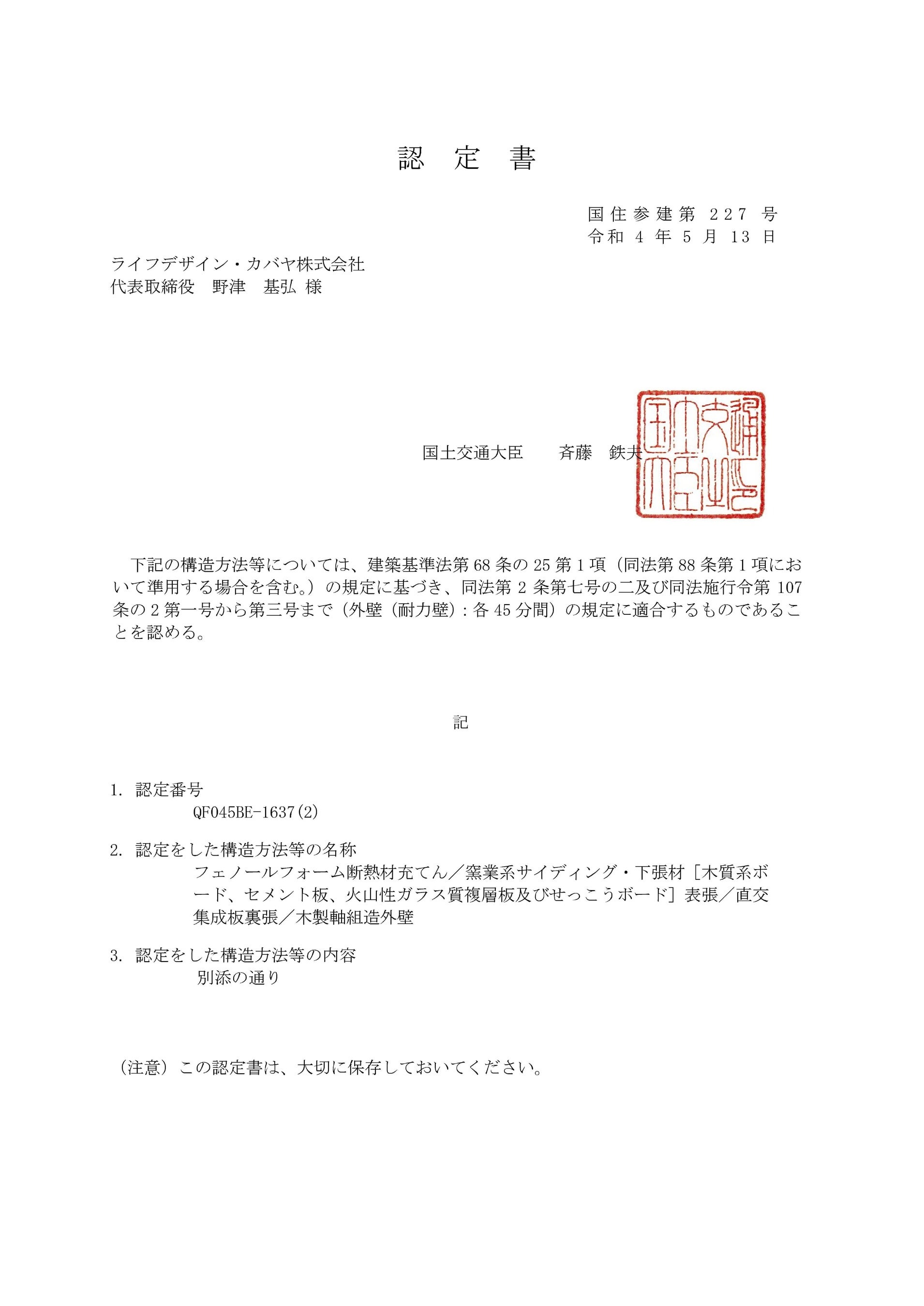 認定をした構造方法等の名称 フェノールフォーム断熱材充てん/窯業系サイディング・下張材[木質系ボード、セメント板、火山性ガラス質複層板及びせっこうボード]表張/直交集成板裏張/木製軸組造外壁