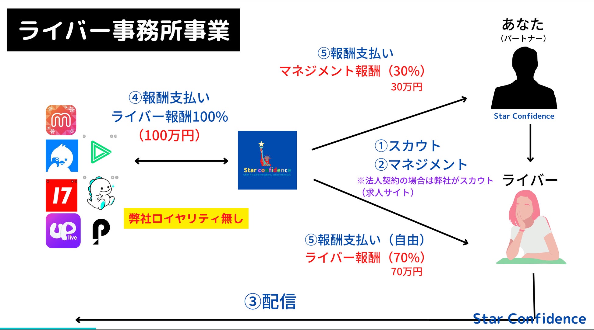 近年、非常に伸びている事業の一つになっており、今後も大きく伸びていくと予想される事業です。ライバー1人1人の夢や目標、ライブ配信を行う目的などに沿ってサポートしていくことで、ライバーから感謝されることが多く非常にやりがいのある事業です。 法人様の本業としてや、セカンド事業としても運用していたり フリーランス、元ライバー、主婦、大学生など様々な方がご活躍されています。 弊社が培ってきたノウハウや配信アプリとのオーガーナイザー契約の内容をご提供している為、安心かつ継続的にビジネスとして活用いただいております。