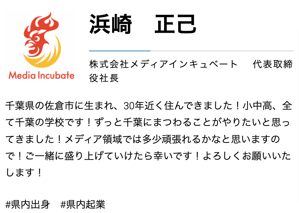 また、代表の浜崎が千葉県佐倉市(http://www.city.sakura.lg.jp/)の出⾝であることもあり、「千葉/CHIBAコンバレー構想」(https://prtimes.jp/main/html/rd/p/000000063.000018590.html)を掲げ、千葉県の産業育成、クリエイターエコノミーの集積地となることを目指しています。