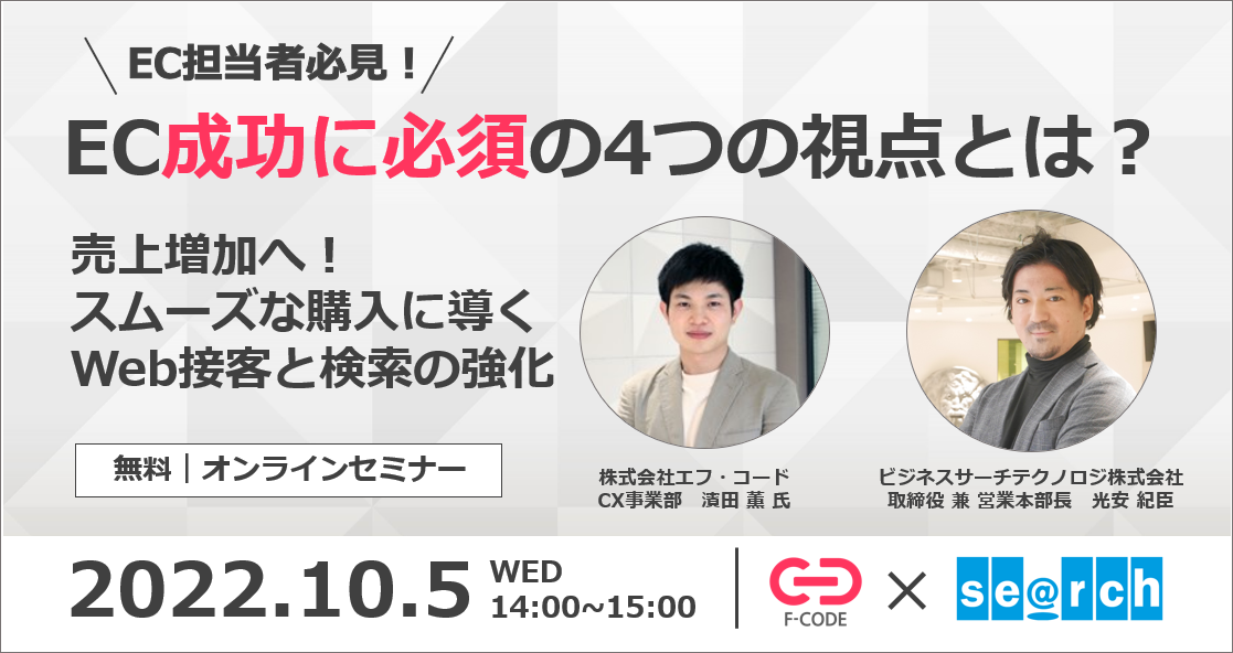 株式会社エフ・コード(本社:東京都新宿区、代表取締役社長:工藤 勉、以下「当社」)は、2022年10月5日(水)に、ビジネスサーチテクノロジ株式会社(本社:東京都新宿区、代表取締役:工藤 智昭、以下、BST)と共催で無料ウェビナー『インサイドセールス×SEOで効率的にリードを増やす方法ウェビナー』を開催します。