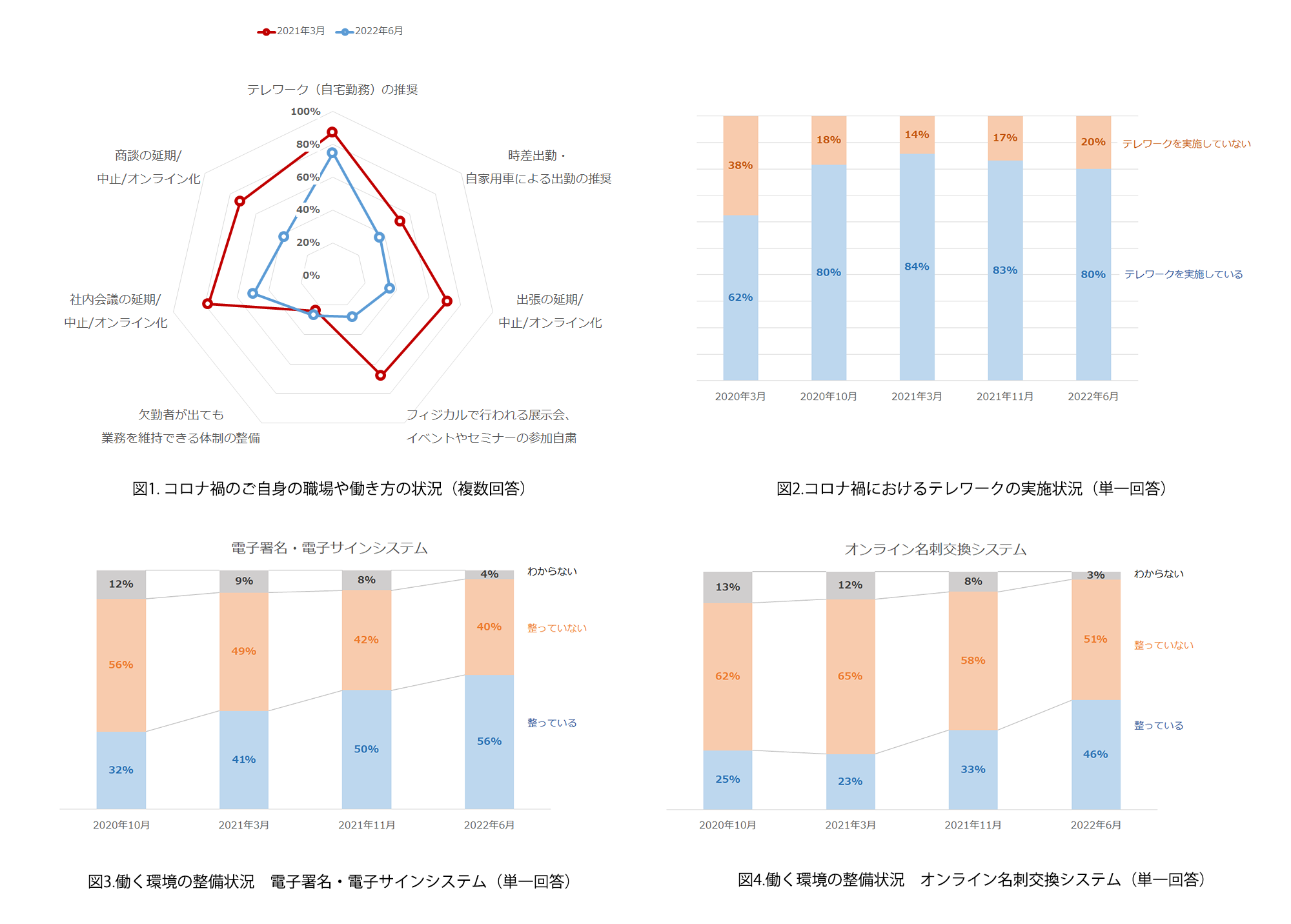 - 「電子署名・電子サインシステム」「オンライン名刺交換システム」の整備が急拡大し、テレワーク前提の環境整備がすすめられている