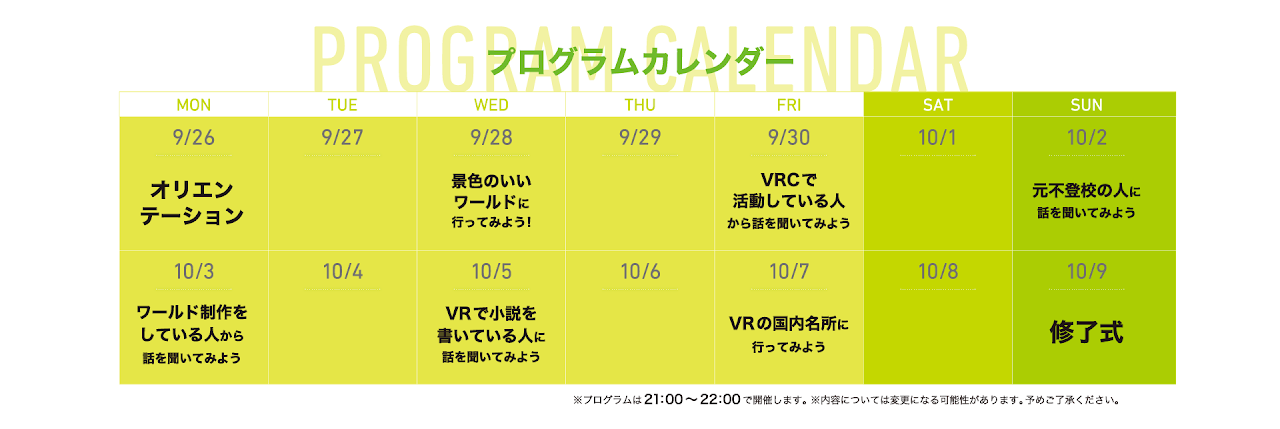 「メタバース不登校学生居場所支援プログラム」は、VRメタバースを使用した不登校学生対象の居場所支援プログラムで9月26日(月)~10月8日(土)に開催されます。