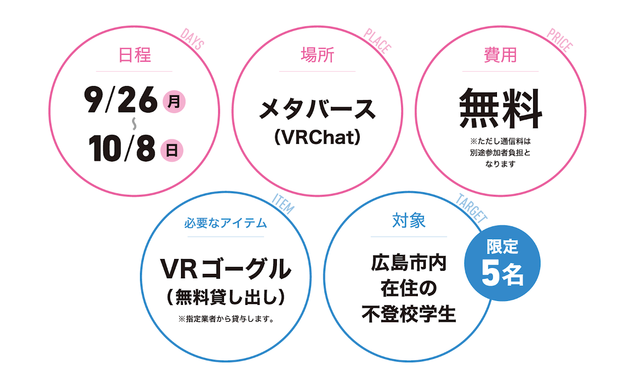 「ばーちゃるケアゆずあっと」主催で行われる、VRメタバースを使用した不登校学生対象の全く新しい居場所支援プログラムです。今回は広島市内在住の不登校学生が対象。