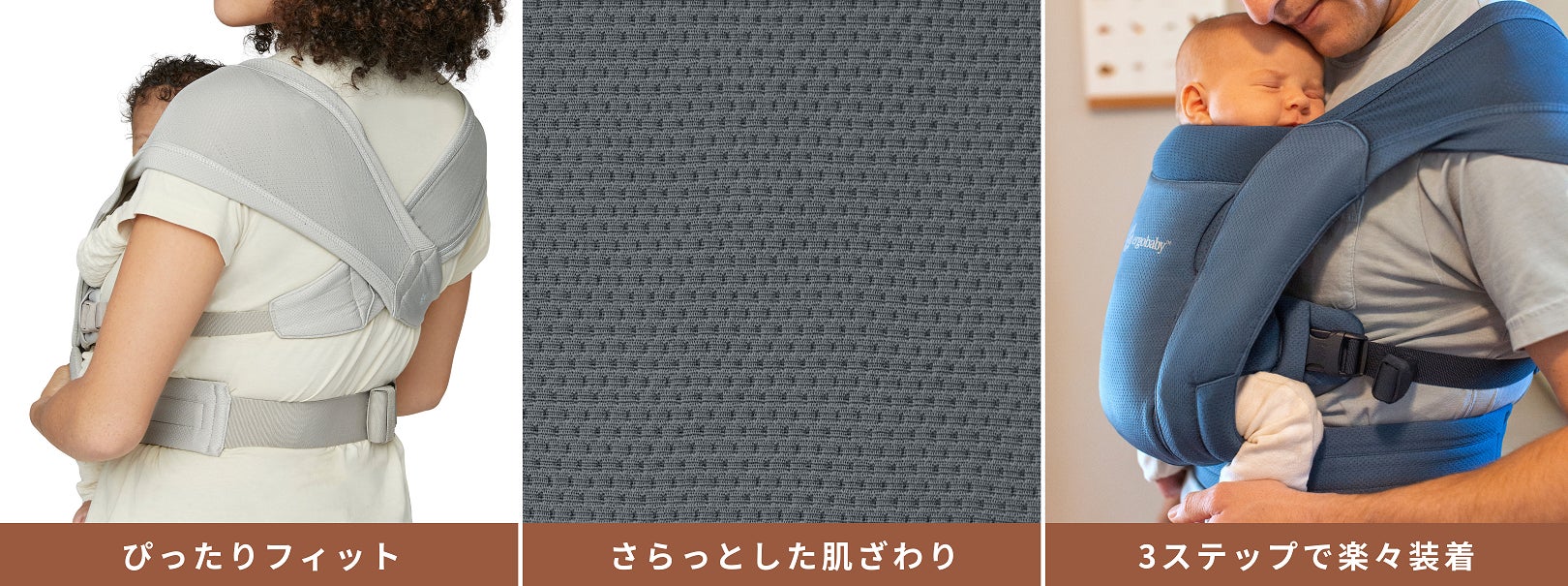 『EMBRACE』は、おうちの中で使用されることが多いモデルです。リラックスタイムに最適なフィット感とやわらかな肌ざわりを追及して誕生しました。これらの魅力はそのままに、パパママのニーズを反映し、通気性に優れたSoft Airメッシュ生地を使用。親子がより心地よい抱っこをかなえます。