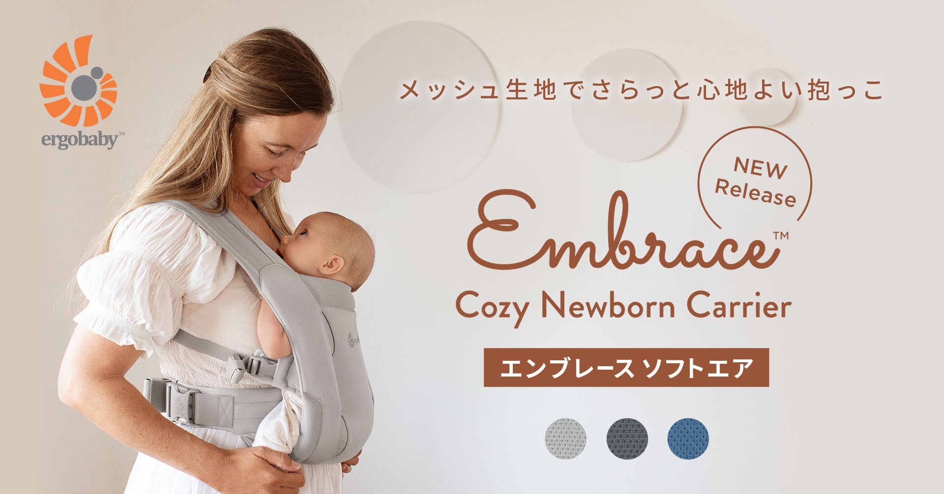 EMBRACEは、生まれたばかりの赤ちゃんにやさしくフィットするストレッチ生地と、はじめての抱っこでも安心のシンプルな装着方法が特長。新生児期やおうちでの抱っこに寄り添うモデルです。